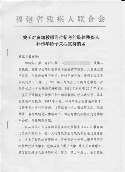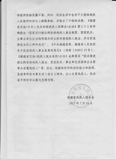 福建省残联曾给连江县教育局发函,希望对林传华给予关爱和支持。本版图片/受访者供图