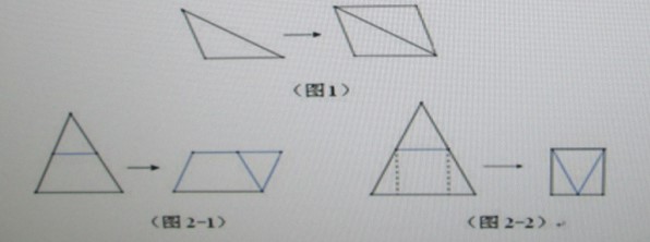 在进行“三角形面积”教学时,推导面积计算公式一般采用两种方法:一种是把两个完全一样的三角形拼成一个平行四边形(见图1);另一种是利用三角形中位线剪拼成平行四边形(见图2-1)或折叠成长方形(见图2-2)