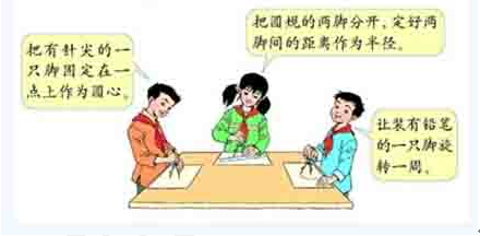 1、教师边讲解边演示如何用圆规快速而准确的画出不同大小的圆:首先将圆规的两脚分开,定好两脚间的距离为半径;其次,把有针尖的一只脚固定在一点上作圆心;最后,让装有铅笔的一只脚旋转一周。