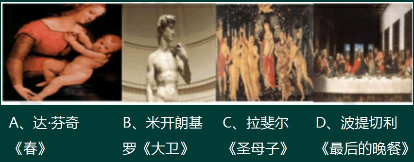 233网校解析:A是拉斐尔的《圣母子》,B是米开朗基罗《大卫》,C是波提切利的《春》,D是达芬奇《最后的晚餐》,只有B是画作、作家、作品名称全部对应正确的选项。