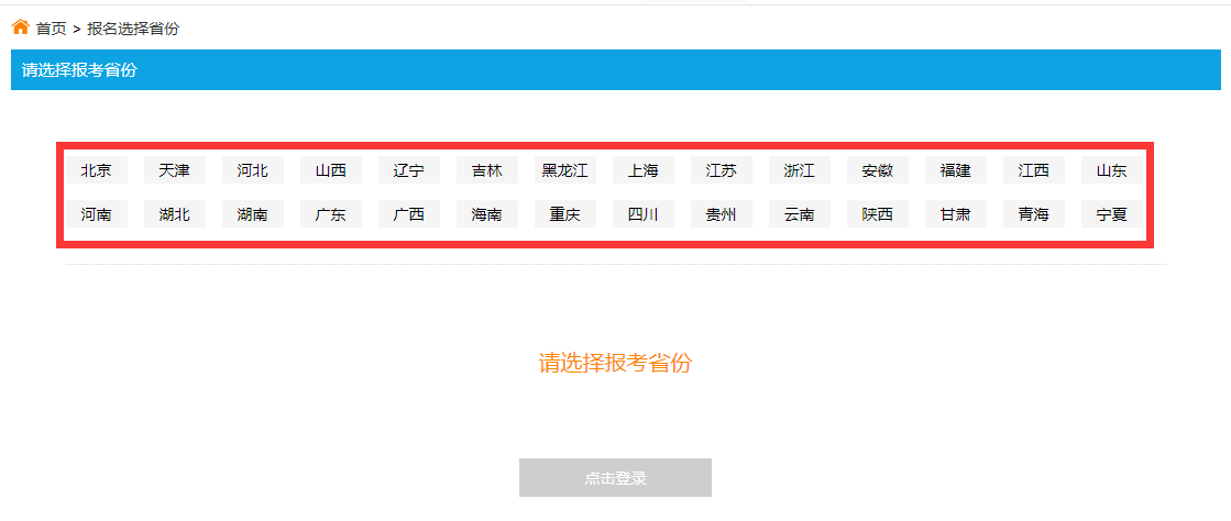进入报名系统后,选择符合报考条件的省份,然后“点击登录”。参加2019上半年教师资格笔试考生直接登录即可,以前年度参加的教师资格证笔试需要重新注册。