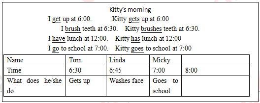 3.Make a conclusion. When we say he/she/other’s name, we change the words ‘get-gets’, ‘brush-brushes’, ‘have-has’, ‘go-goes’.