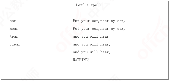 2. Listen to the tape and let students pay attention to the pronunciation of “ear”, and then ask the students question: what does “ear” sounds like in these words?