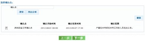 确认点列表中会显示认定机构网报时间段内所有参与确认工作的确认点信息。这些信息包括确认点名称、确认范围、确认开始和结束时间。申请人需根据各现场确认点列出的确认范围,选择属于自己的确认点,并点击该确认点前的单选按钮,然后点击“下一步”按钮,进入申报第五步。