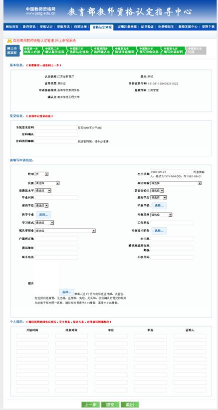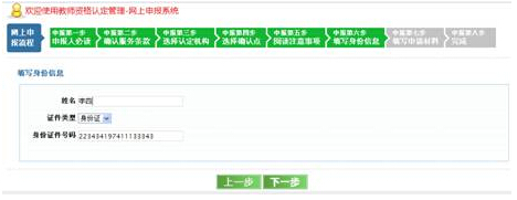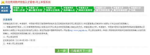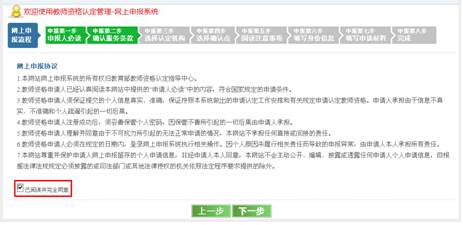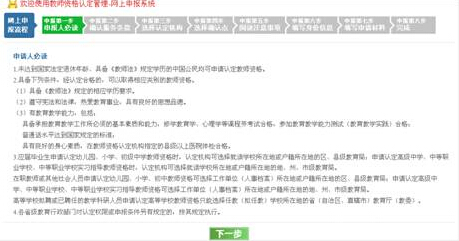 认真阅读“申请人”内容,尤其注意您应该选择的教育行政部门(即认定机构)。阅读完内容后,点击“下一步”按钮,进入申报第二步。