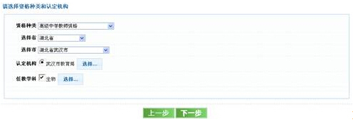 选择好认定机构后,请点击“任教学科”后的“选择”按钮,则会显示与您所选择的资格种类相对应的任教学科。在所列出的任教学科列表中选择您拟申请任教的学科。这样,您就完成了第三步所要求填写的内容。此时,请点击“下一步”按钮,进入申报第四步。