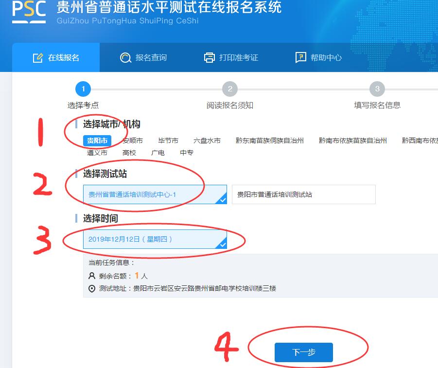 2.选择“贵阳市”→贵州省普通话培训测试中心-1→选择相应的测试日期→下一步