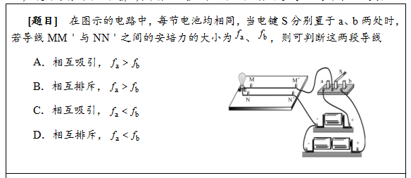 某教师为了了解学生对电路、安培力、左手定则等知识的综合掌握与运用情况,设计了若干检测题,其中第5题如下。检测结果不少学生选择了C选项。