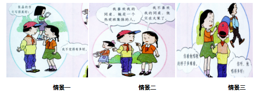 情景三:放学后,同学C背着书包回家,禁不住小声地唱起了歌曲,不远处的同学B和同学A对此议论开来。B不屑一顾:“你看他唱歌的样子多难看。”A说:“你听,他唱得多好。”